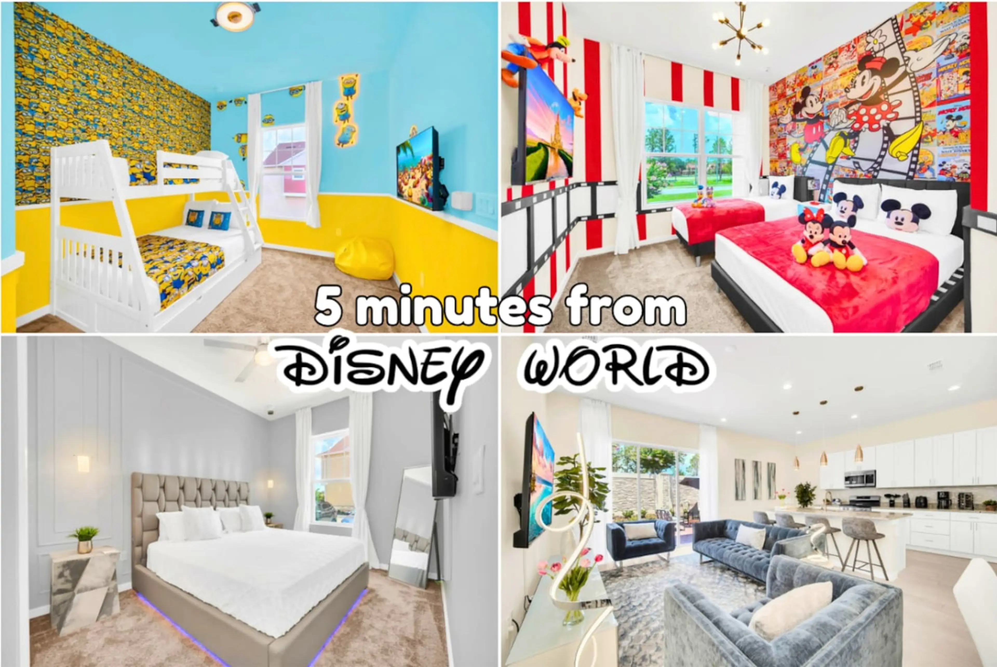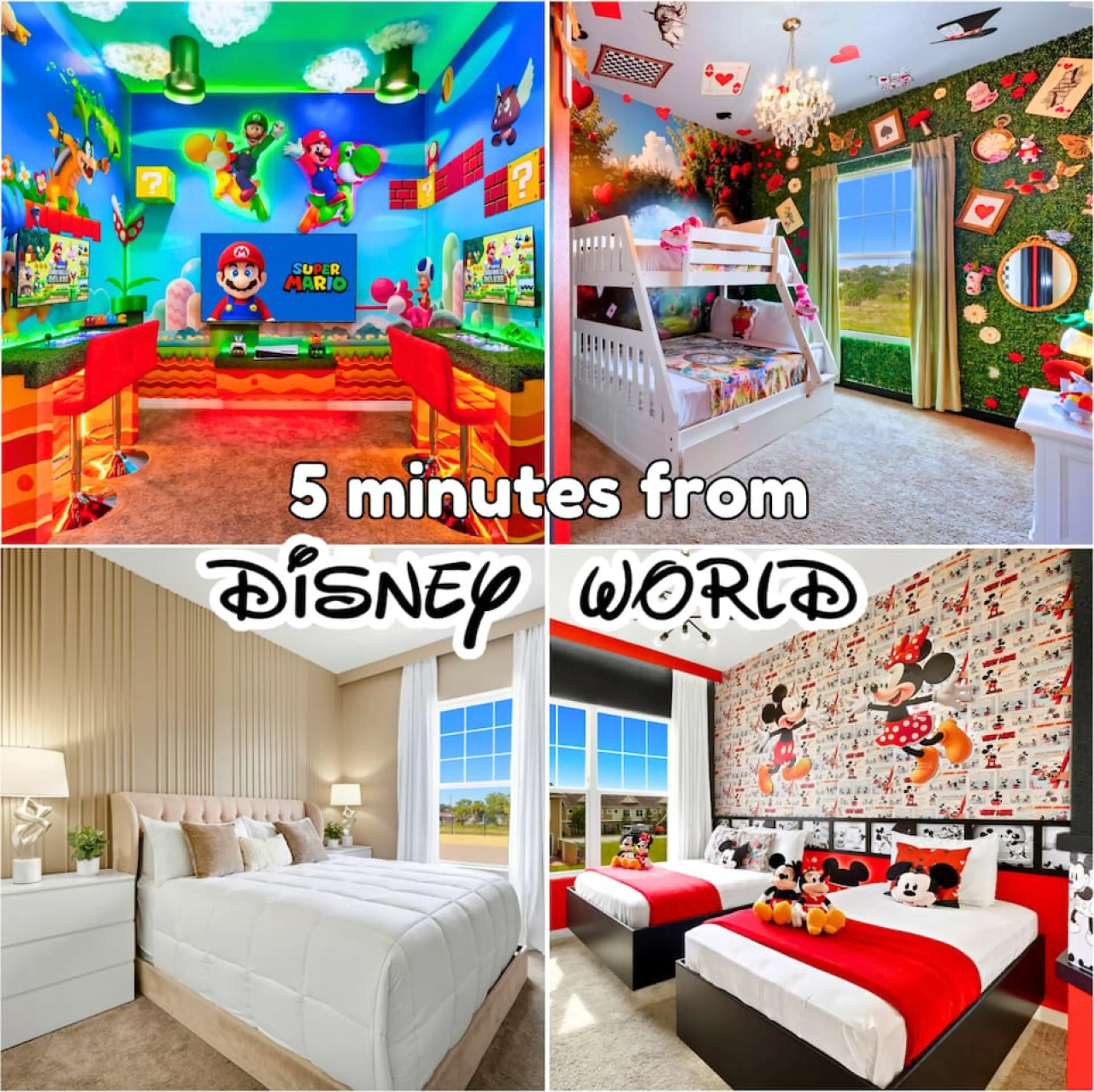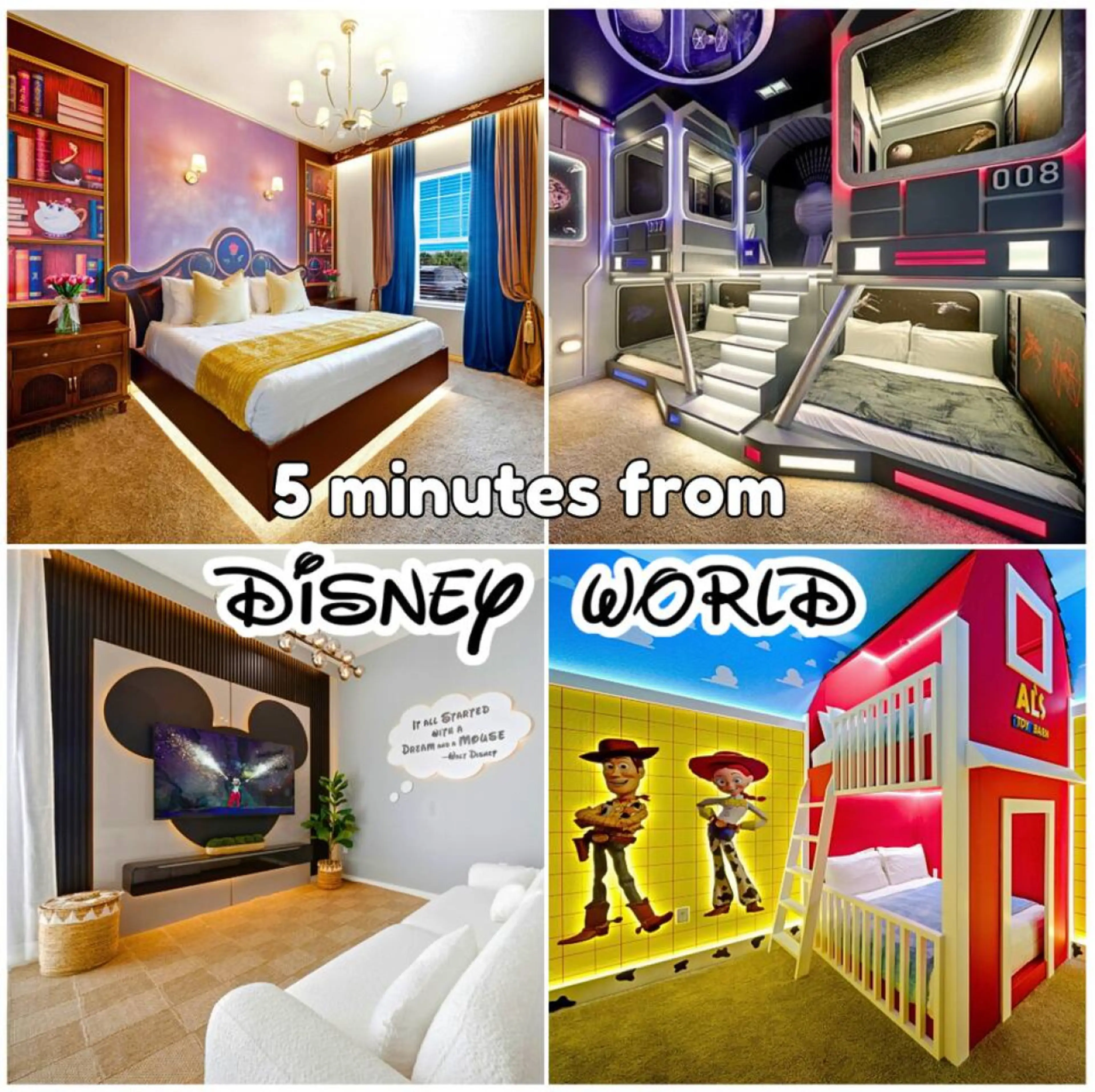 Looking for a magical getaway? Rent your next vacation home with us and experience the enchantment of themed rooms that bring magical worlds to life! Choose from our spacious 5-bedroom, 4-bedroom, or 3-bedroom homes, all located in a peaceful and relaxing condominium. Each home is designed to elevate your stay, offering a perfect blend of comfort and adventure for you and your family.